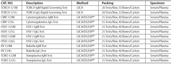 TORCH IgM test panel and TORCH IgG test panel are rapid lateral fl ow test designed for the qualitative detection of the IgM and IgG antibodies to the following viruses in human serum/plasma specimens: Toxoplasmosis (TOXO), Cytomegalovirus (CMV), Rubella Virus (RV), Herpes Simplex Virus Type 1 (HSV-1) and Herpes Simplex Virus Type 2 (HSV-2).