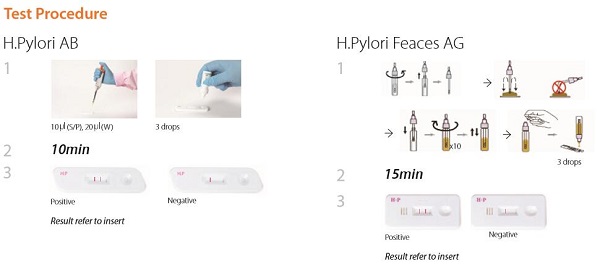 H.Pylori Antibody Rapid test kits are an assay for the qualitative detection of antibodies of all isotypes (IgG, IgM, IgA, etc) specifi c to Helicobacter pylori in human serum, plasma and whole blood specimens. This test kit is intended as an aid in the diagnosis of H. pylori infection in patients with gastrointestinal symptoms. While H.Pylori antigen Feces test kits are used to detect H.Pylori antigen in human feces specimens.