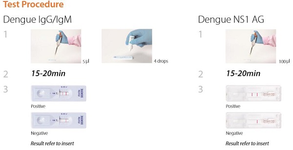 Dengue IgG/IgM Rapid Test kits are solid phase immunochromatographic assays for the rapid, qualitative and differential detection of IgG and IgM antibodies to dengue virus in human serum and plasma specimens. While Dengue NS1 antigen test kits are used to detect Dengue NS1 antigen in serum, plasma and whole blood specimens. Both are intended for professional use, as aid in the presumptive diagnosis of dengue infection, and primary and secondary dengue infection.