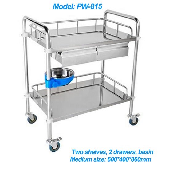 Features: - Stainless Steel - Detachable - Two Shelves - Medium Size: 600*400*860mm - With Two Drawers and Basin - With Castors