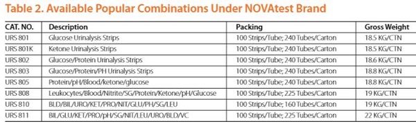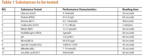 urinalysis Reagent Strips up to 11 parameters: ascorbic acid, glucose, bilirubin, ketone, specific gravity, blood, pH, protein, urobilinogen, nitrite and leukocytes. Certain configurations of strips can be read instrumentally with some mainstream Urine Analyzers in the market