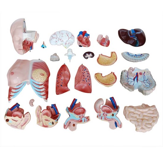 This outstanding torso features an exposed spine with removable vertebra and spinal cord segments, a female breast plate and interchangeable male and female genitalia. The female organs include a fetus in the womb. Dissected into 23 parts: torso, female breast plate, head, eyeball, brain, vertebra spinal nerves, lung (2 parts), heart (2 parts), liver, kidney, stomach (2 parts), intestines (4 parts), male genitalia (2 parts) and female genitalia with fetus (3 parts). Made of PVC plastic. Mounted on a plastic base.