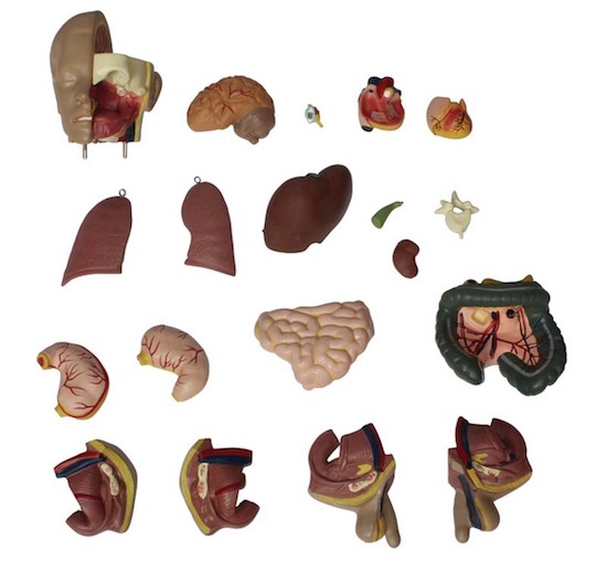 This unisex torso including 20 parts: torso, head, eyeball, brain, lung (2 parts), heart (2 parts), liver, gallbladder, kidney, stomach (2 parts), intestines (2 parts), male genitalia (2 parts), female genitalia (2 parts) and vertebra spinal nerves.