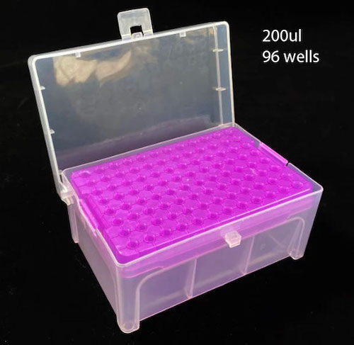 Specifications: - Universal use - 10ul: white, 96 wells - 200ul purple, 96 wells - 1000ul blue, 100 wells - Other sizes and color are available