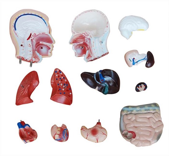 This male torso features 13 parts, including torso, head (2 parts), brain, lung (2 parts), heart (2 parts), stomach, liver, kidney, pancreas and spleen and intestine. Made of PVC plastic. Mounted on plastic base.